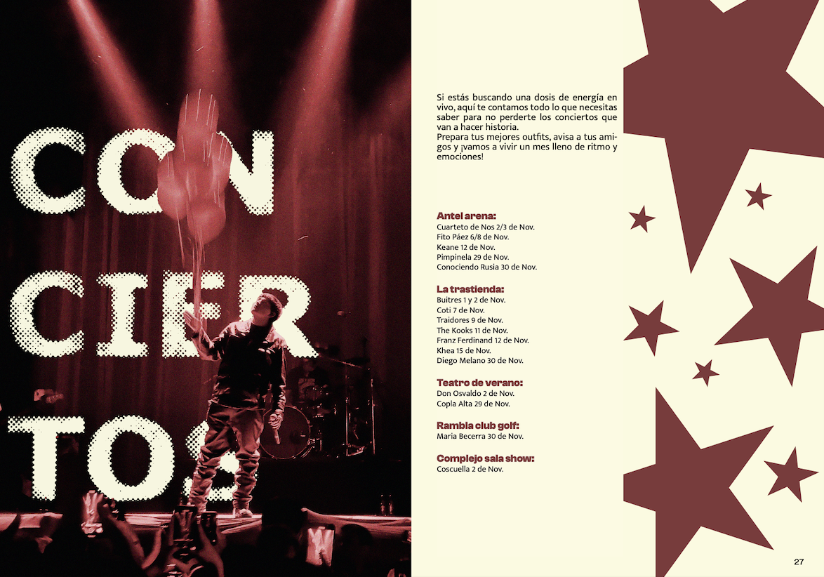 Sección de revista "hitsconnection" relatando que conciertos hay en el mes.